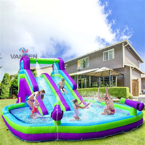 Water Slide Colorful Purple, Green, And Blue Double Slide With Large Pool And Water Gun Sprayers For