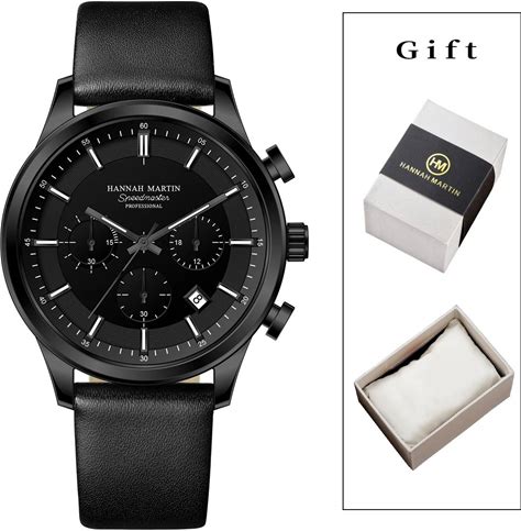 Hannah Martin Men Gift Box Men Watch Black Leather 41mm Business Multifunctional Timing Clock Quartz
