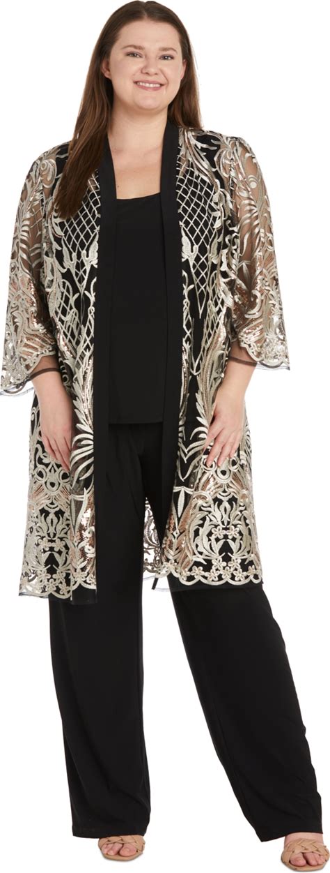 R & M Richards Plus Size Embroidered Duster Jacket, Tank And Pants 3-Pc. Set - Black/Gold - Size 20W